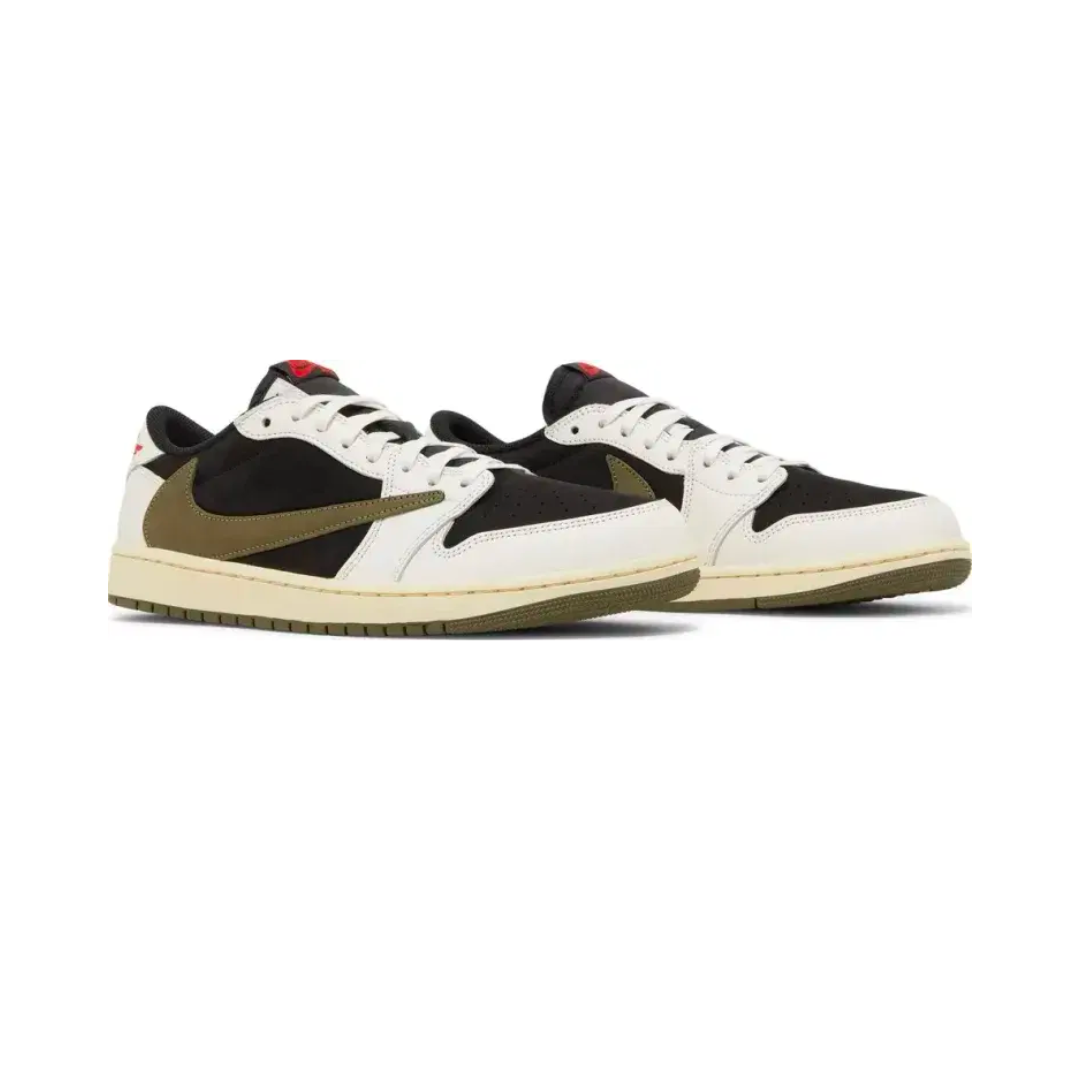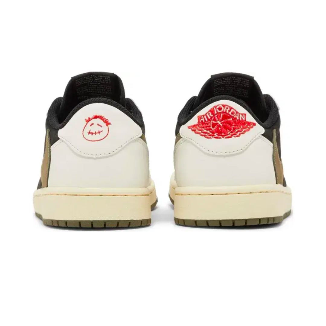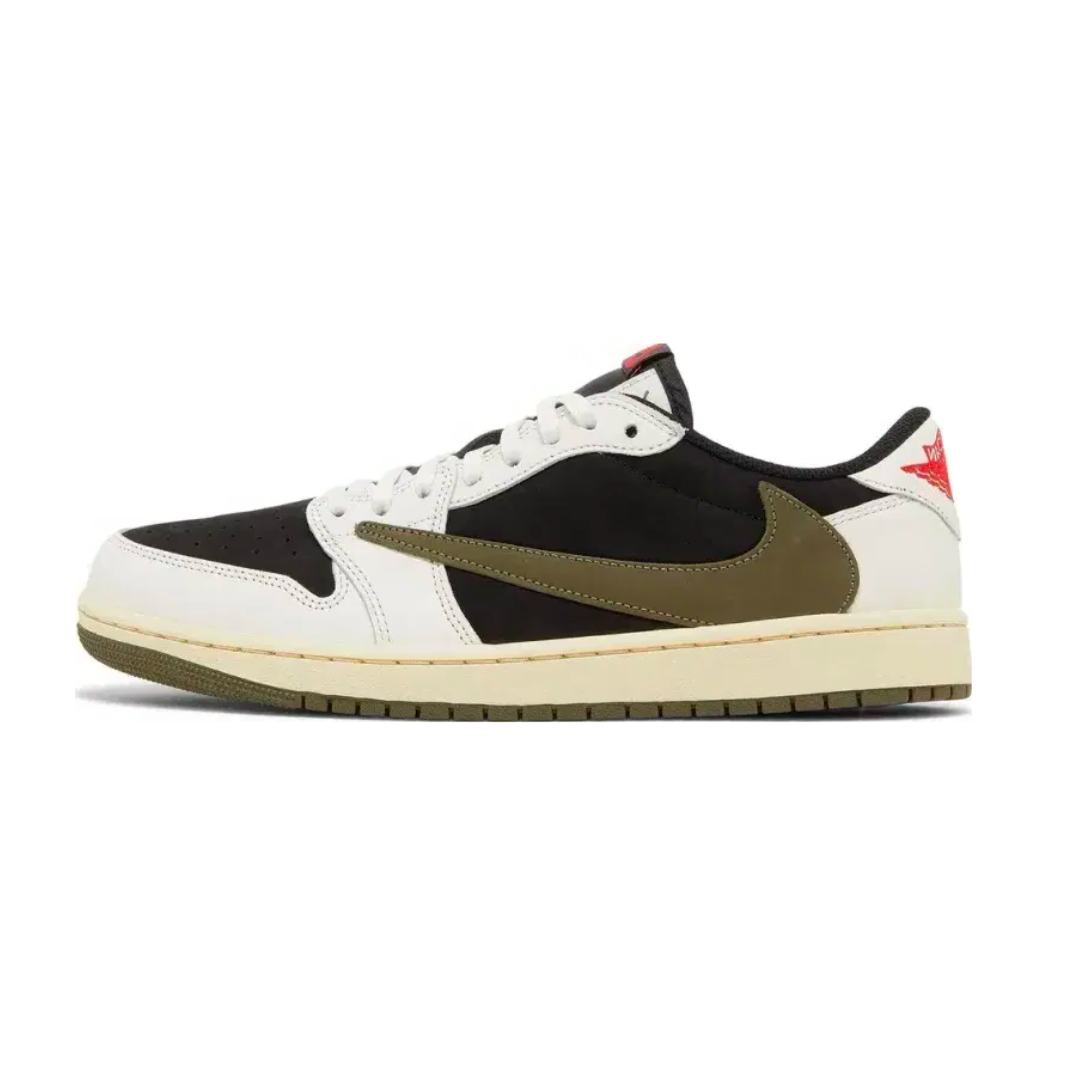The Travis Scott x Women’s Air Jordan 1 Retro Low OG ‘Olive’ presents the chart-topping rapper’s first sneaker collaboration in female sizing. The upper combines a black suede base with off-white leather overlays and olive suede Swooshes, featuring a reverse check on the lateral side and a traditional design on the opposite side. The neutral earth tones are punctuated by bold crimson accents, highlighted by woven Nike Air tongue tags and mismatched Jordan and Cactus Jack branding on each heel tab. Anchoring the low-top is a rubber cupsole that pairs vintage off-white sidewalls with an olive green rubber outsole.