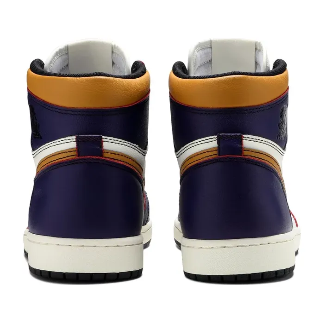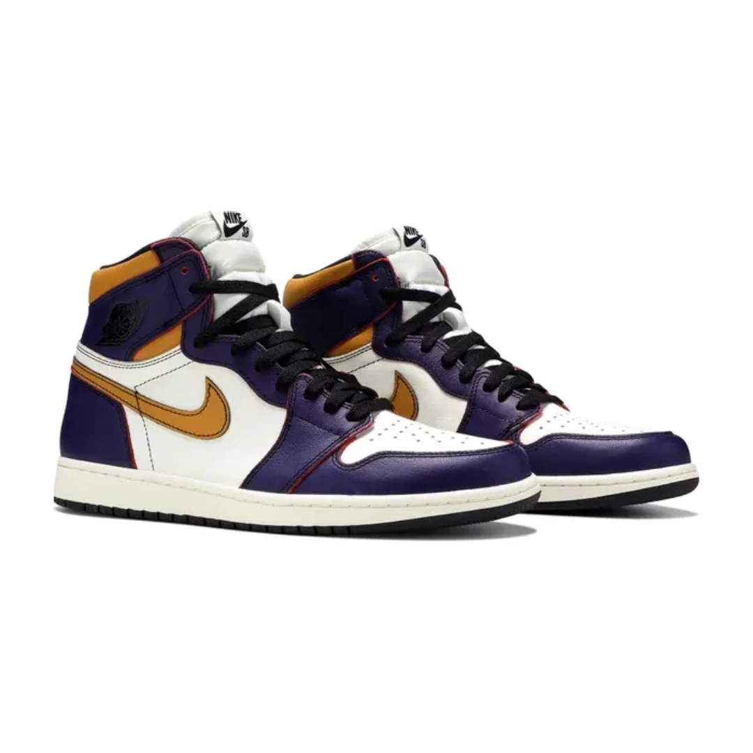The iconic Air Jordan 1 silhouette was a skate staple in the 80s due to its full-leather construction and tough midsole/outsole combination. Working together again with Nike SB, the Air Jordan 1 returns in this ‘Lakers vs. Bulls’ edition that launched in May 2019. This colorway pays homage to the legendary matchup through a Court Purple and University Gold scheme on the leather upper that wears away to reveal red and black alternate hues. Lateral Swooshes, a Wings logo and nylon tongue fall in line with the original look.