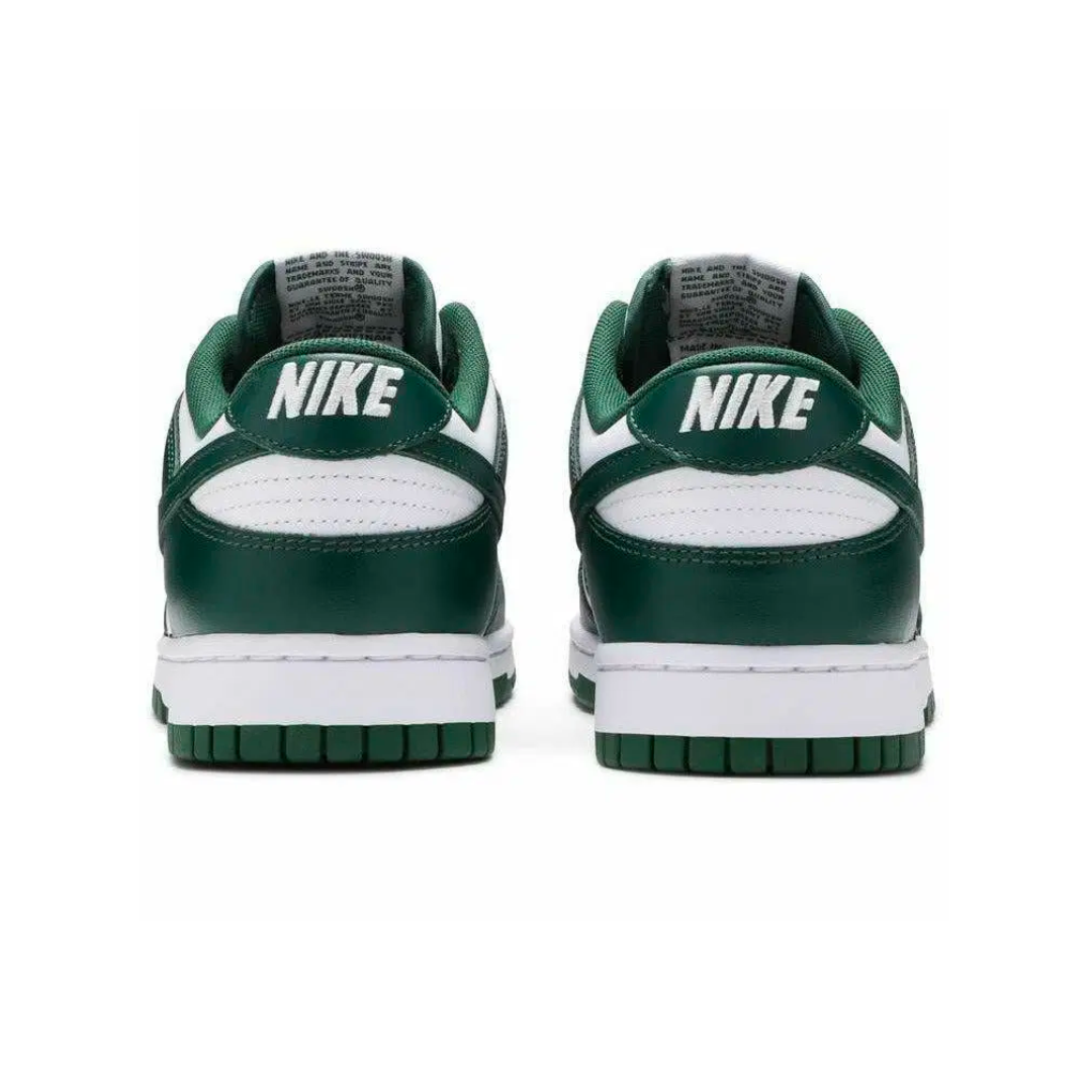 Crafted with premium leather, the Nike Dunk Low Spartan Green features a bold green overlay contrasted by a crisp white underlay, creating a sleek and sophisticated look. The perforated toe box ensures breathability, while the padded collar provides additional comfort and support. The signature Swoosh in green adds a touch of elegance, perfectly complementing the overall design.